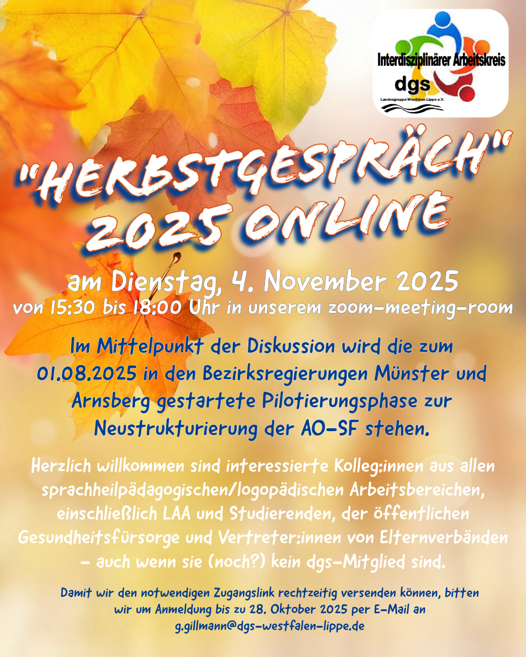 Wir laden herzlich ein zum Herbstgespräch 2025 – online am Dienstag, den 04. November 2025 von 15.30 – 18.00 Uhr in unserem zoom-meeting-room.